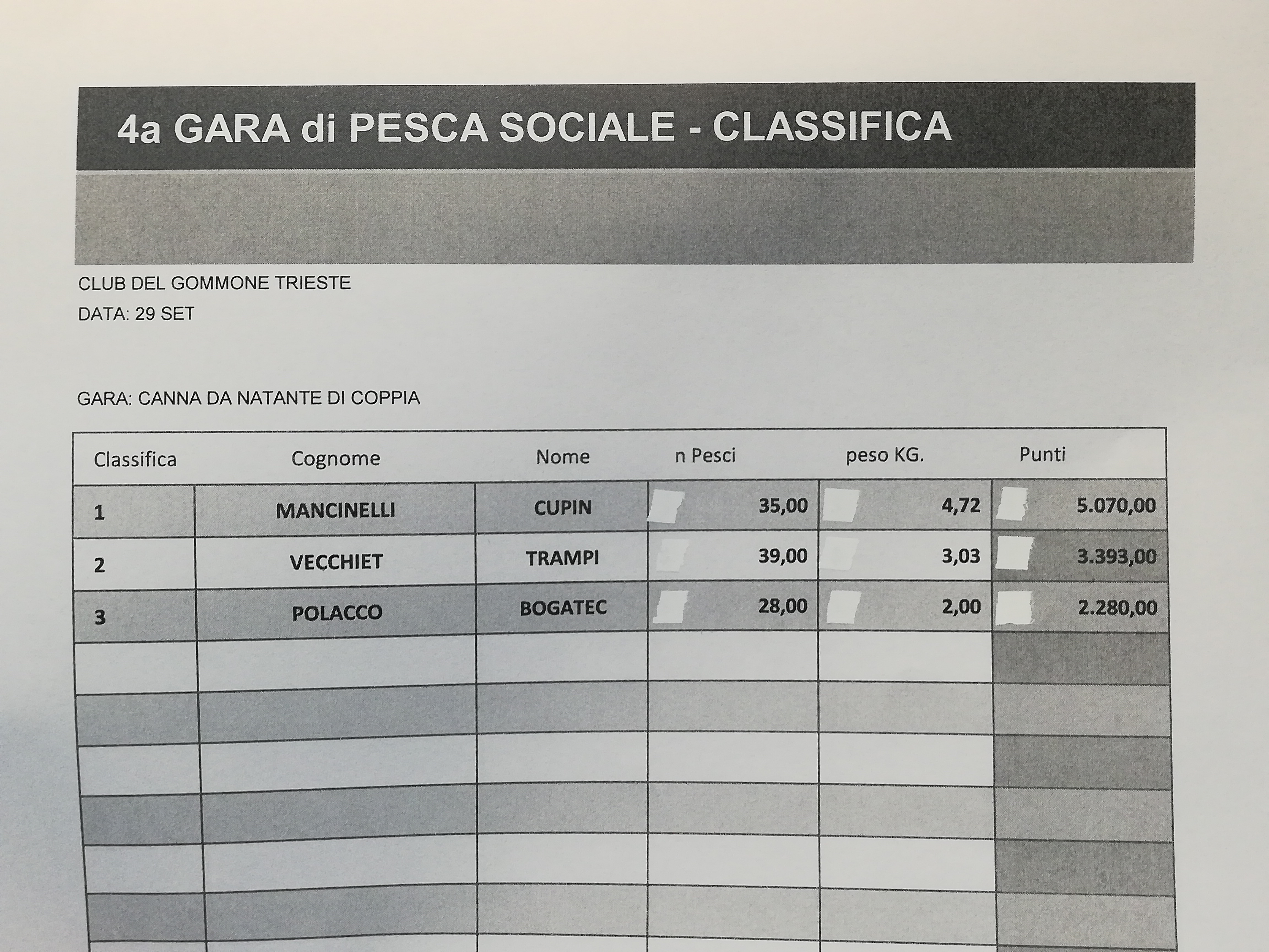 Domenica 29 Settembre la 4a gara Sociale in coppia – canna da barca. Alle sette del mattino usuale ritrovo dei Soci partecipanti al Club del Gommone non senza qualche sbadiglio…iniziano i preparativi…il varo dei mezzi nautici e la partenza alle ore 07.40. Fortunatamente la giornata pur leggermente ventilata, volge al meglio con uno splendido sole che ci accompagnerà per tutto il giorno. Alle 12.45 il rientro dei concorrenti e l’immediata pesatura del pescato decreta la coppia vincitrice. Subito dopo il tradizionale “rebechin” e “quatro ciacole” fra amici sognando Orade e Branzini all’amo delle nostre canne.